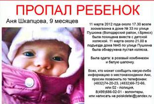 Напомним, 9-месячную Аню Шкапцову похитили в прошлое воскресенье, 11 марта возле зоомагазина на улице Пушкина в доме №33.