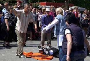 В сети появилась видео первого взрыва, произошедшего на трамвайной остановке в Днепропетровске 27 апреля. Взрывной волной выбило все стекла трамвая, стоявшего на остановке, в результате первого взрыва пострадали 13 человек.