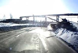 Сметая сугробы на обочине, танк быстро проехал по дороге буквально в несколько десятках метров от легкового автомобиля, на котором был установлен видеорегистратор, который все это успешно заснял.