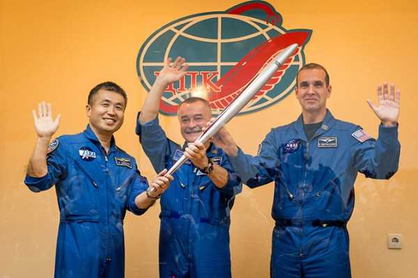 Космонавты Роскосмоса Тюрин Михаил, Ричард Мастраккио (астронавт НАСА), и астронавт японского агентства Ваката Коичи доставят факел на МКС.