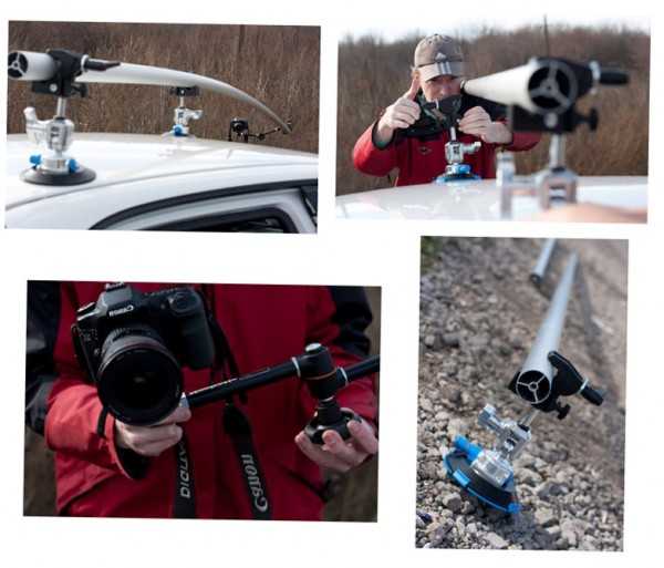 Простенькая конструкция из 2-х присосок, специальной "руки" и 4х метров трубы просто укрепляется на авто.
