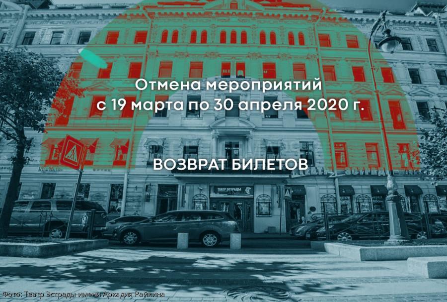 18 марта 2020 года, мы получили новое Постановление Правительства Санкт-Петербурга №127 о запрете проведения любых зрелищных и досуговых мероприятий. В связи с этим мы вынуждены отменить все события, проводимые на сцене Театра Эстрады им. Аркадия Райкина в период с 19 марта по 30 апреля 2020 включительно. Важная информация о возврате билетов: