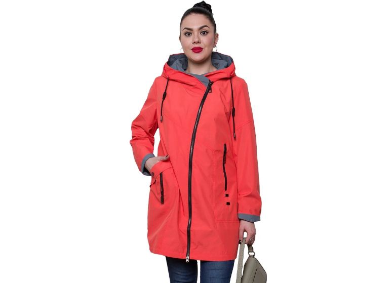 Удлиненная ветровка женская больших размеров. Легкая ветровка на сезон весна, осень. Куртка весенняя на асимметричной металлической молнии, прямой крой, удобный капюшон с контрастными вставками, два прорезных кармана на молнии и 1 потайной, подклад у модели плащ из полиэстер.