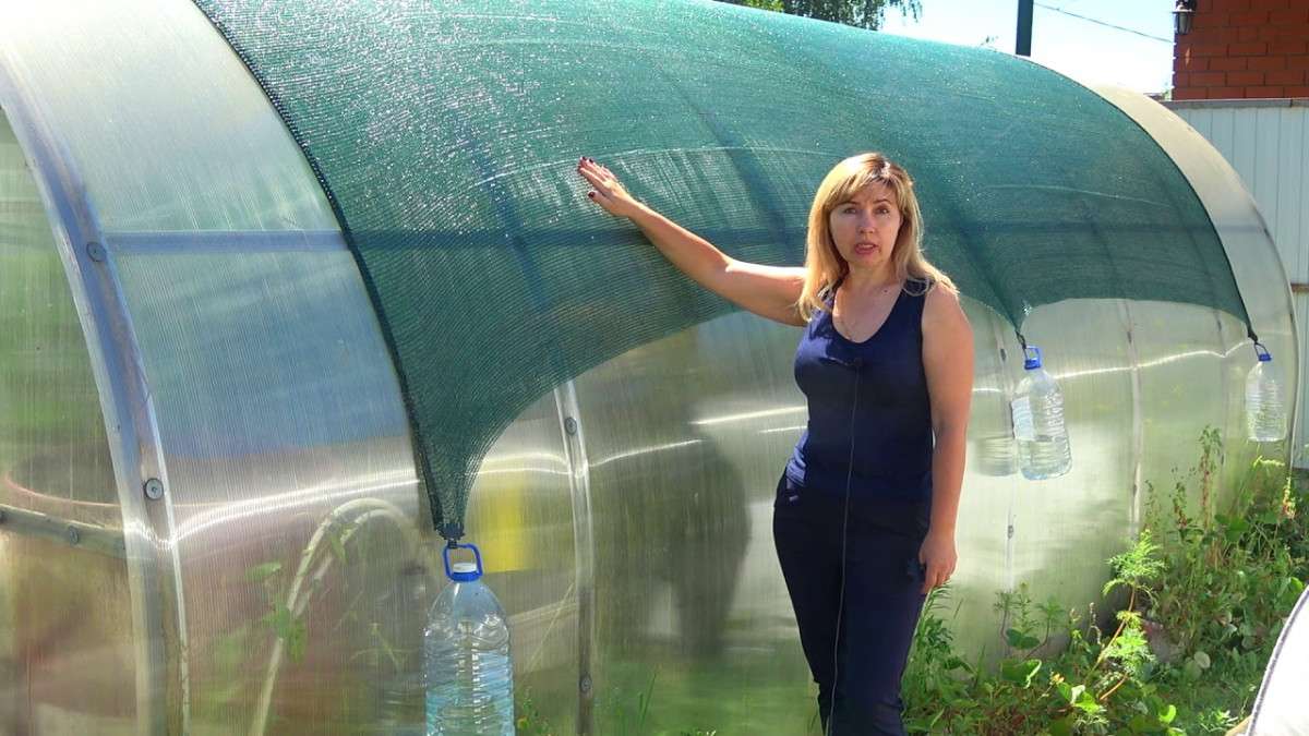 При жгучем солнце страдают культуры, расположенные на расстоянии 0,5–0,7 м от внутренних стенок теплицы. Поэтому у садоводов возникает вопрос – чем лучше затенить теплицу. Эксперты рекомендуют использовать затеняющую сетку. Её натягивают над теплицей, попросту укрывая сооружение и фиксируя края. Достоинства такой защиты:
