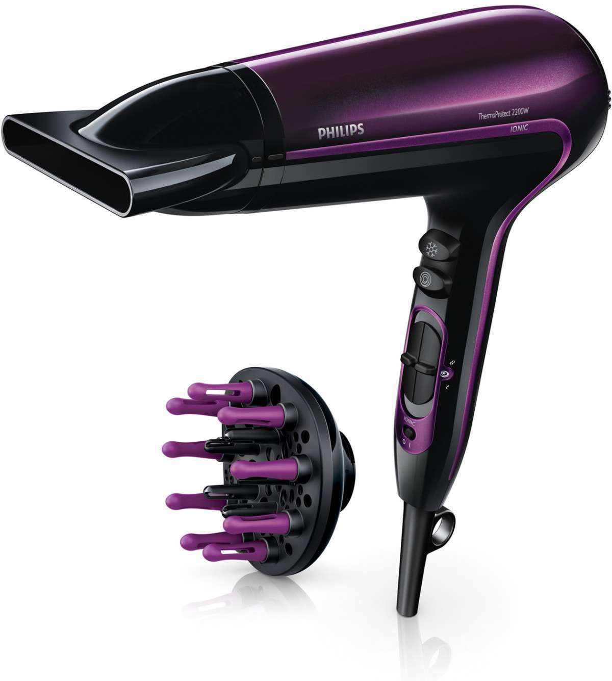 Открывает наш рейтинг фен с насадкой диффузором philips hp8233 thermoprotect ionic, выполненный в корпусе из пластика фиолетового цвета. Он понравится тем, кто не представляет свою жизнь без этого прибора, и пользуется им ежедневно. Высокая мощность 2200 Вт позволит высушить и уложить волосы максимально быстро, а функция ионизации и возможность регулировки температуры воздушного потока сделают процесс сушки безопасным для здоровья ваших волос. Кроме того, philips оснащен функцией холодного воздуха, что позволит использовать его даже при неудовлетворительном состоянии волос, так как высокие температуры не окажут никакого воздействия на структуру волос и не пересушат их. В комплект входят две насадки - концентратор и диффузор - с их помощью можно создавать различные укладки за минимальное количество времени.