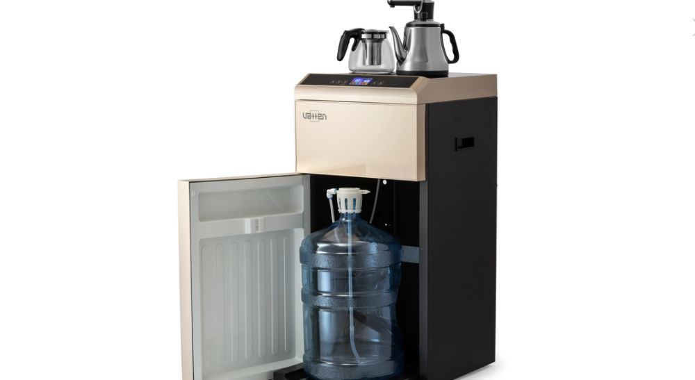 Напольный кулер Vatten L50RFAT является новым словом в конструкции кулеров: представлен в виде чайного столика с 2 чайниками. Один из них – для заварки, другой – для кипятка. Бутыль загружается в нижнюю часть. Предусмотрен шкафчик для посуды. Кулер отличается высокой производительностью. Для доведения воды до кипения (100 градусов) требуется мощность 1350 Вт, производительность при этом составляет 15 л/ч. Кулер оснащен дисплеем, куда выводятся параметры функционирования. Для подачи воды предусмотрен один сенсорный кран. Бесперебойная работа в течение длительного времени возможна при температуре окружающего воздуха от +10 до +32 градусов. Эффектный, удобный в использовании кулер украсит любое помещение, станет его своеобразной изюминкой.