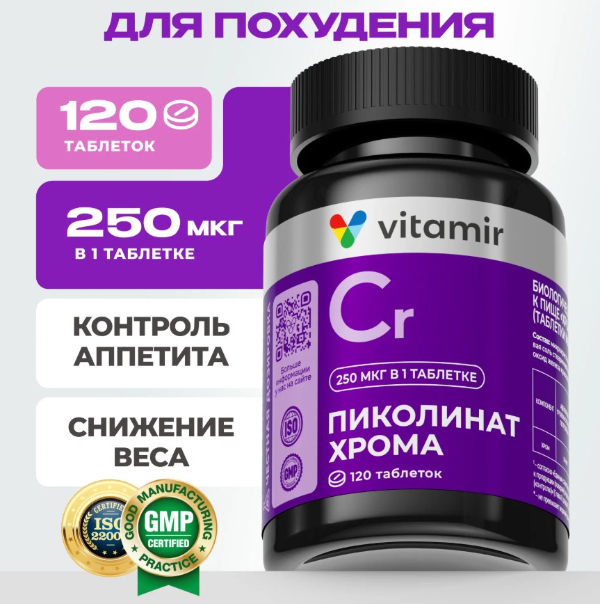 БАД VITAMIR PRO с пиколинатом хрома — эффективный продукт для контроля аппетита и поддержания нормального уровня глюкозы в крови. Хром помогает улучшить чувствительность клеток к инсулину, снижает тягу к сладкому и способствует здоровому похудению. Этот БАД помогает нормализовать углеводный обмен, поддерживать сердечно-сосудистое здоровье и выведение токсинов из организма. В упаковке 120 таблеток, что подходит для длительного приема. Продукт сертифицирован по стандартам GMP и ISO, что гарантирует высокое качество.