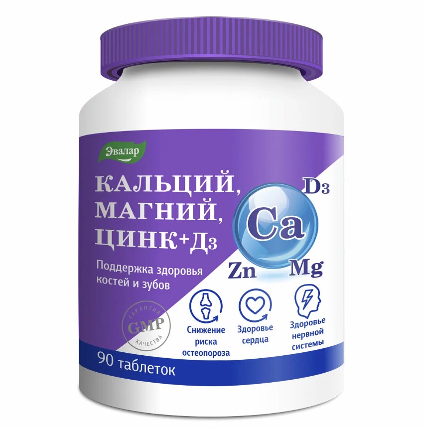 Кальций Магний Цинк + Д3 от Эвалар — это сбалансированная добавка, направленная на поддержание здоровья костей, суставов и сердечно-сосудистой системы. В составе препарата — кальций для укрепления костной ткани, магний для улучшения минерального обмена и укрепления суставов, цинк для стимуляции выработки коллагена и витамина D3 для правильного усвоения кальция. Этот БАД помогает нормализовать минеральный баланс и уменьшить риск остеопороза, а также способствует улучшению работы нервной системы и снижению частоты судорог.