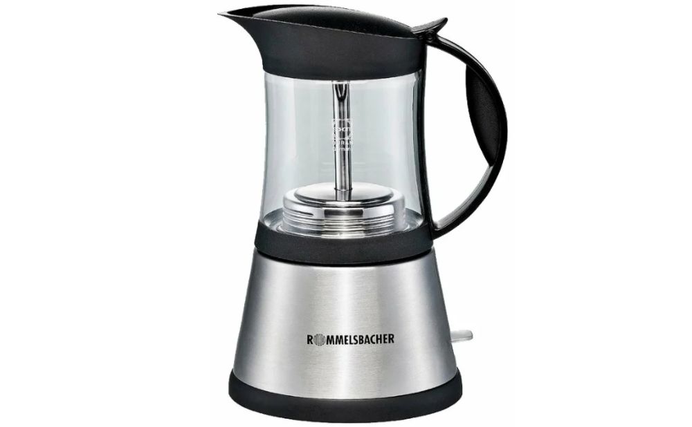 Наш рейтинг гейзерных кофеварок электрических не обошел вниманием модель Rommelsbacher EKO 366/E, которая может приготовить 6 чашечек кофейного напитка. Имеет устройство гейзерного типа, мощность 356 Вт. Объем кофеварки 350 мл, но можно ограничиться 3 чашками, деления внутри нижнего сосуда кофеварки покажут требуемое количество воды. В фильтр закладывают молотые зерна кофе, пар с давлением 10 бар поднимает горячую воду. Материалом корпуса и кувшина послужила нержавеющая сталь. Rommelsbacher EKO 366/E работает от сети, лишняя часть провода сворачивается и прячется в отсек. Процесс сборки упрощают стрелочки-указатели на корпусе. Забывающим выключать электроприборы пригодится функция автоматического отключения. Дизайн в виде конуса, усеченного сверху, привлекает простотой и минимализмом.