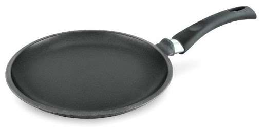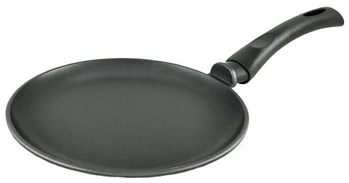 Блинная сковорода имеет низкий борт и удобную ручку, благодаря чему легко переворачивать и снимать блины. Утолщенное дно обеспечивает особые термоаккумулирующие свойства: блин равномерно пропекается по всей толщине и красиво румянится с обеих сторон. Благодаря антипригарному покрытию блины всегда легко снимаются со сковороды и не пригорают, даже при выпекании без использования масла. Дизайн корпуса сковороды разработан так, чтобы при выпекании не нарушалась целостность блина, и красиво румянился рисунок.