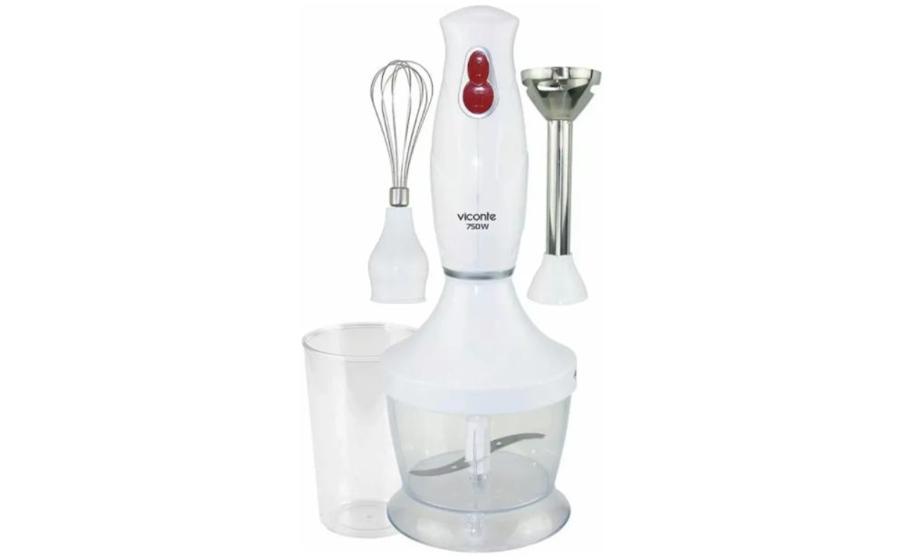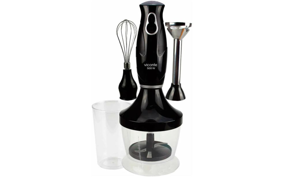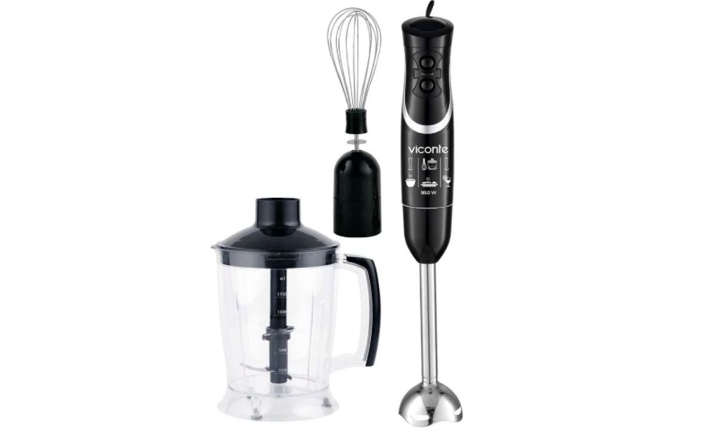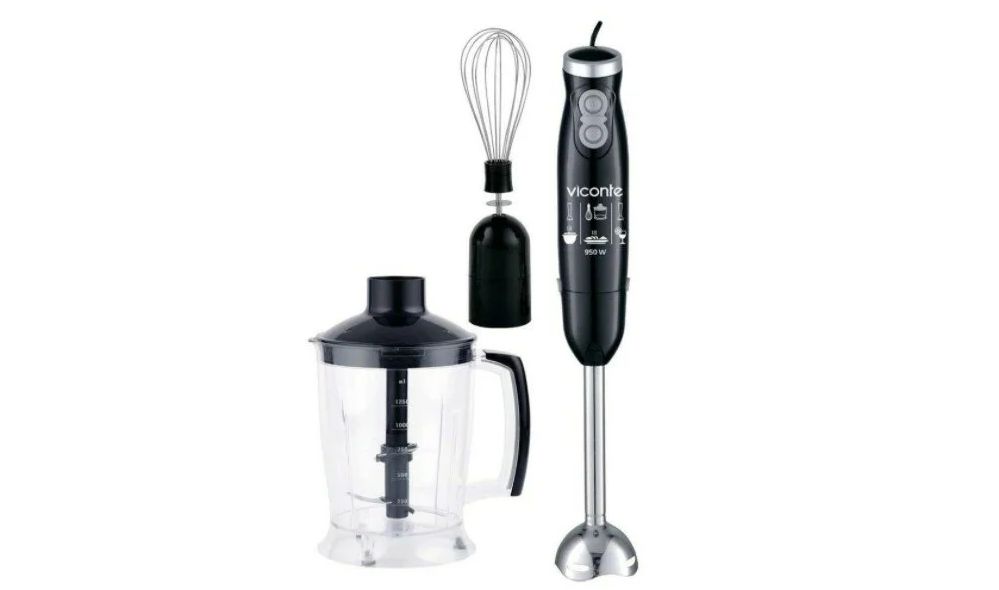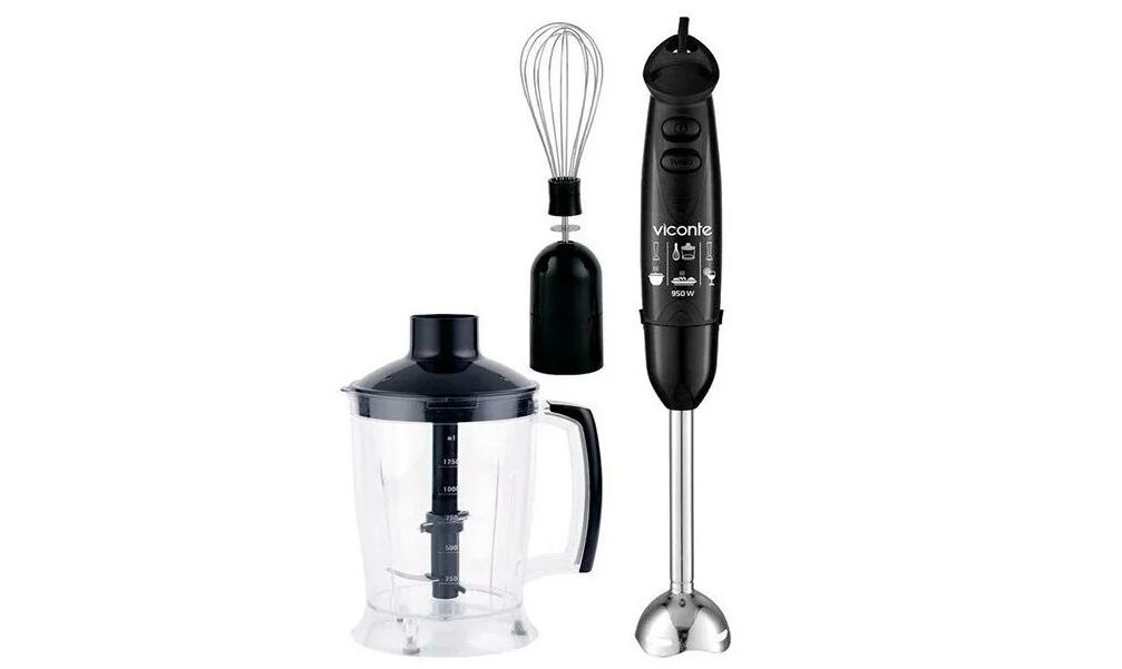 Погружной блендер Viconte обладает мощностью 950 Вт, имеет 2 скорости работы и импульсный режим. Прибор снабжен металлической ножкой, венчиком для взбивания, чашей объемом 1250 мл и ножом из 4 лезвий для рубки и измельчения. Предусмотрена автоматическая блокировка при неправильно установленной насадке, а также защита от перегрева.
