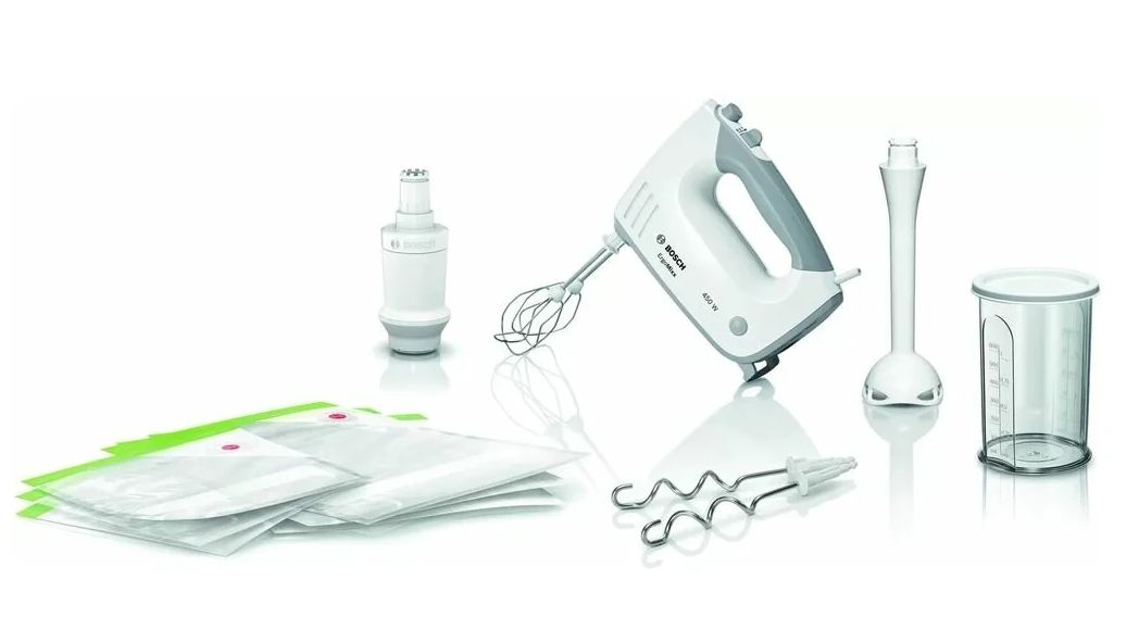 Миксер Bosch MFQ364V0 с чашей имеет эргономичный дизайн, подчеркивающий высокое качество прибора. Модель функционирует в ручном режиме. Мощный мотор в 450 Вт работает легко и тихо. Ручной миксер имеет три металлические насадки: традиционную насадку-венчик, специальную насадку-крюк для замешивания густого теста и насадку-блендер. Функция турборежима позволит ускорить процесс и придать ингредиентам нужный объем. Из пяти скоростных режимов можно выбрать оптимальный для каждого конкретного случая. В комплекте также идет вакуумный насос насадка и по 3 вакуумных пакета с замком, объем 1,2 л и 3,8 л. В комплекте к миксеру прилагается вместительная чаша с крышкой для смешивания объемом 0,6 л. Она выполнена из прозрачного пластика. Благодаря этому удобно отслеживать уровень содержимого.